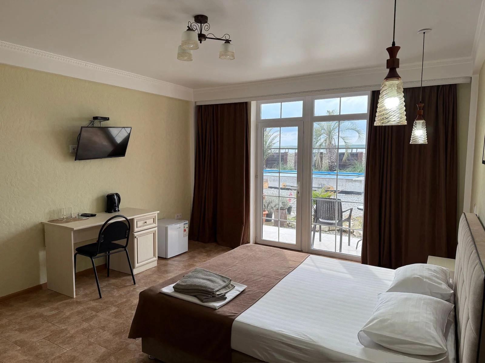 2 осн. места. 1 доп. место. Балкон: с мебелью, терраса. Мебель: вешалка, диван, зеркало, кровать двуспальная, прикроватные тумбочки, стол, стулья, шкаф. Оборудование: сплит-система, телевизор, холодильник. Санузел: с душем, туалетные принадлежности. Сервис: Wi-Fi бесплатно, смена полотенец, смена постельного белья, уборка номера.