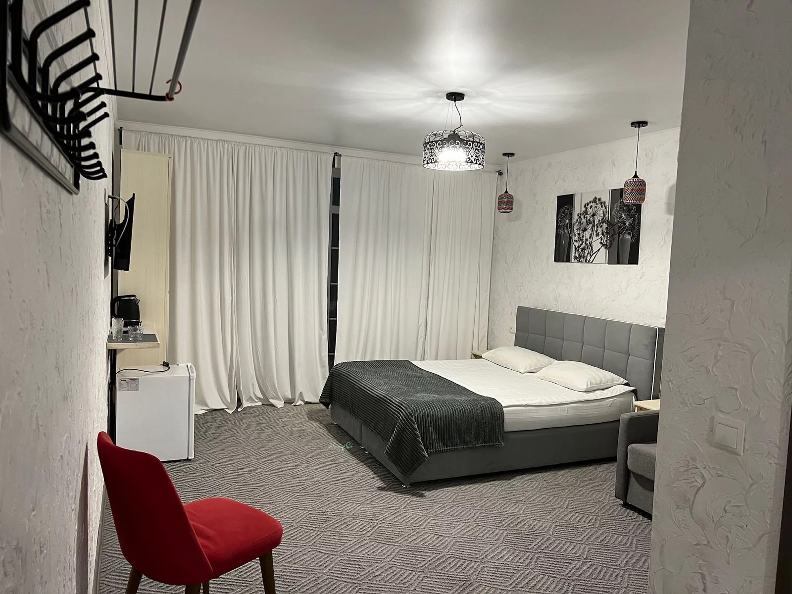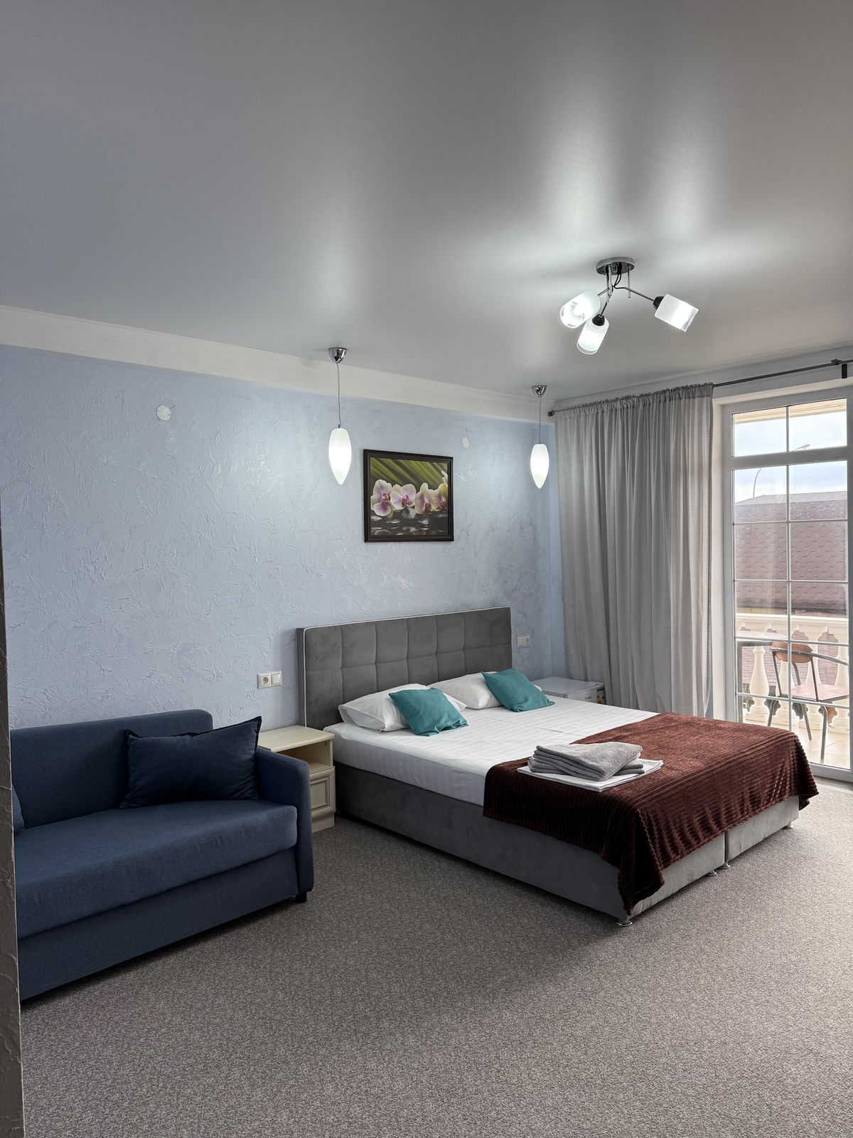 2 осн. места. 1 доп. место. Мебель: вешалка, диван, зеркало, кровать двуспальная, прикроватные тумбочки, стол, стулья, шкаф. Оборудование: сплит-система, телевизор, холодильник. Санузел: с душем, туалетные принадлежности. Сервис: Wi-Fi бесплатно, смена полотенец, смена постельного белья, уборка номера.